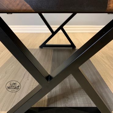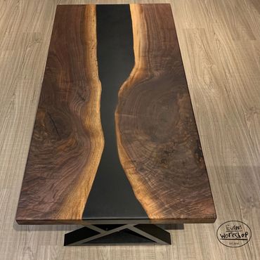 Canadian black walnut coffee table with black epoxy and metal X legs