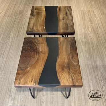 2 matching Canadian black walnut side tables with black epoxy and hairpin legs