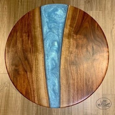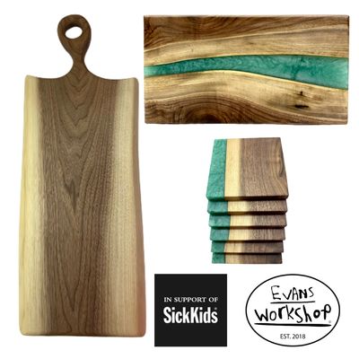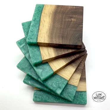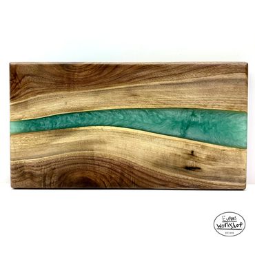 I received lots of ideas on what I should make; from desks to cutting boards, coffee tables and more. Someone suggested that I make a serving board set and that’s what I did 😃. This set includes a charcuterie board, a pearl green epoxy serving board and a matching set of coasters. I made all items using my favourite wood, Canadian Black Walnut.
